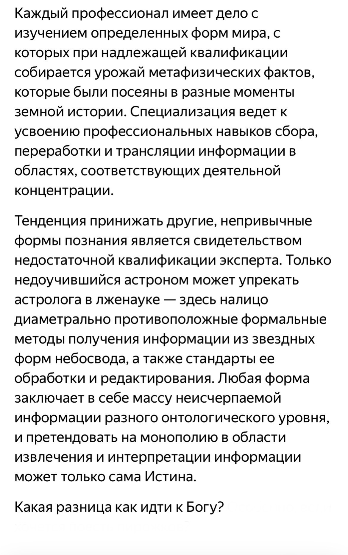 И потому, моя разработанная техника по расчету личного кода MetaWay, в котором содержатся расшифровка талантов, предрасположенность, особенностей психики и желательной деятельности для человека, как способ помочь человеку найти свой личный смысл жизни, вряд ли заслужила бы у А.И.Осипова доверие, а скорее приравнялась бы к ереси. Хотя как знать… Его высокий уровень сознания, возможно, дал бы этим увлечениям совсем неожиданную оценку… ведь он все же таки профессор Духовной академии. Но узнать поточнее его мнение не представляется возможным.
